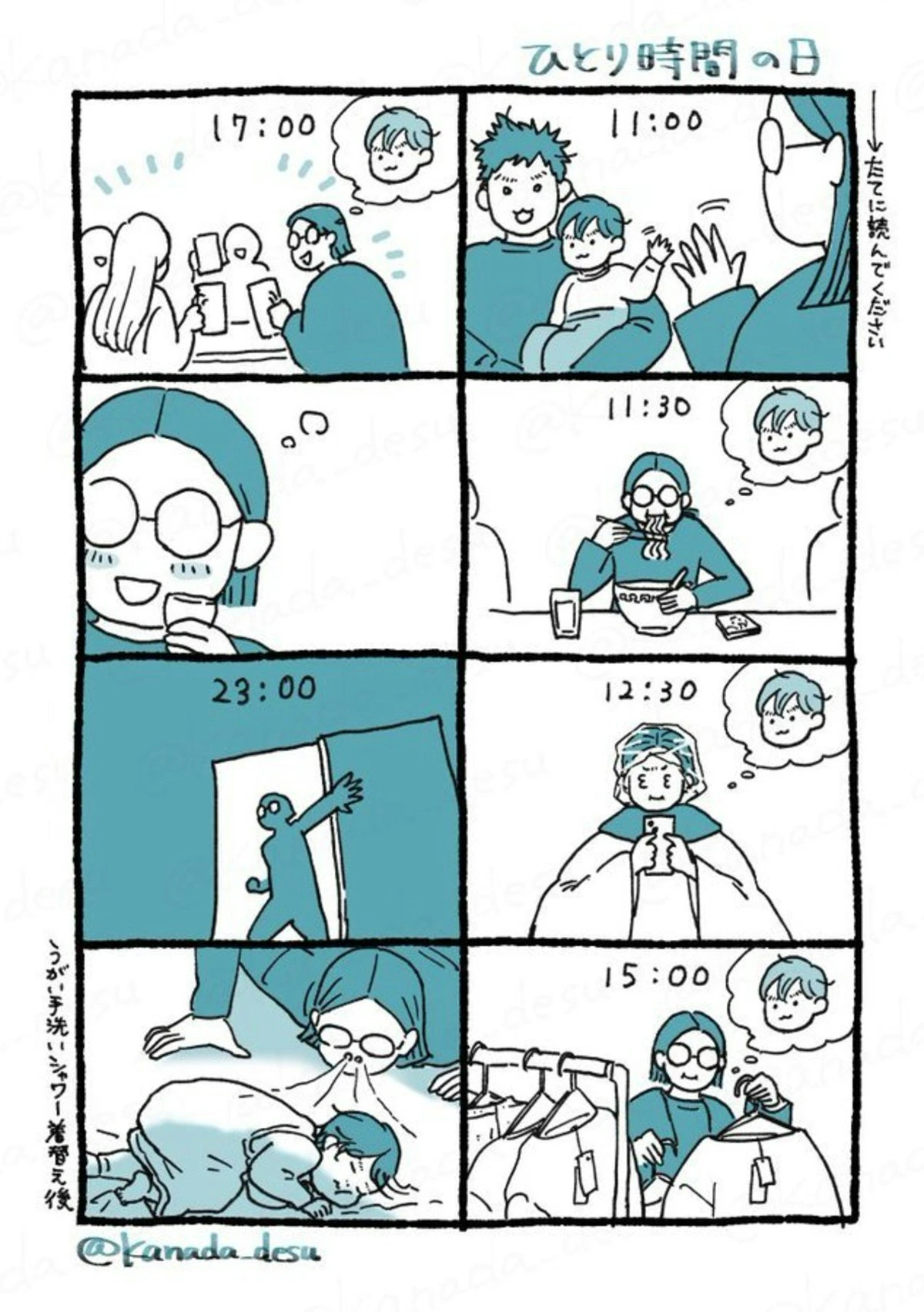 「ひとり自由時間の日」のリアルを描いた漫画が話題になっていました。かなださんはある日、たまには自分のための時間を、と家族と離れて過ごす貴重なひとり時間を満喫します。ママあるあるな投稿に思わずくすっと笑っちゃいますよ。