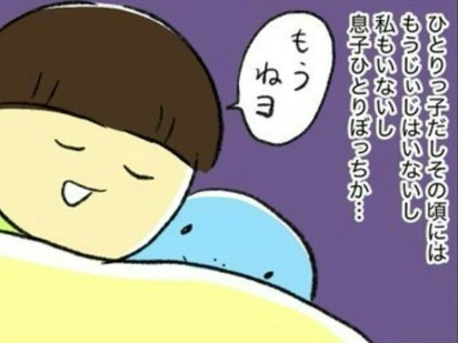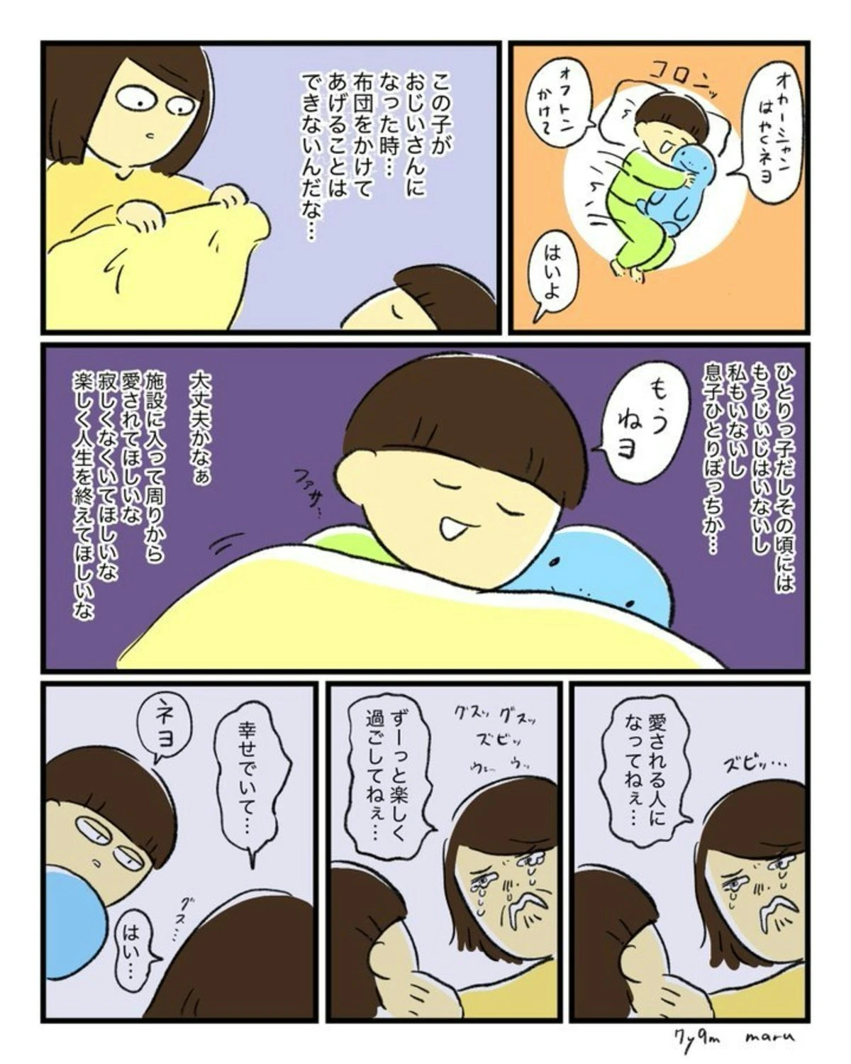 寝る前に息子さんに布団をかけようとしたところで「おじいさんになった時、布団をかけてあげることはできないんだな…」と思いが込み上げてきたまるさん。布団をかけてあげることは、なんて大きな愛なんだ…とじんときました。最後の3コマは涙、涙の表情も相まって、きゅうっと切なく。