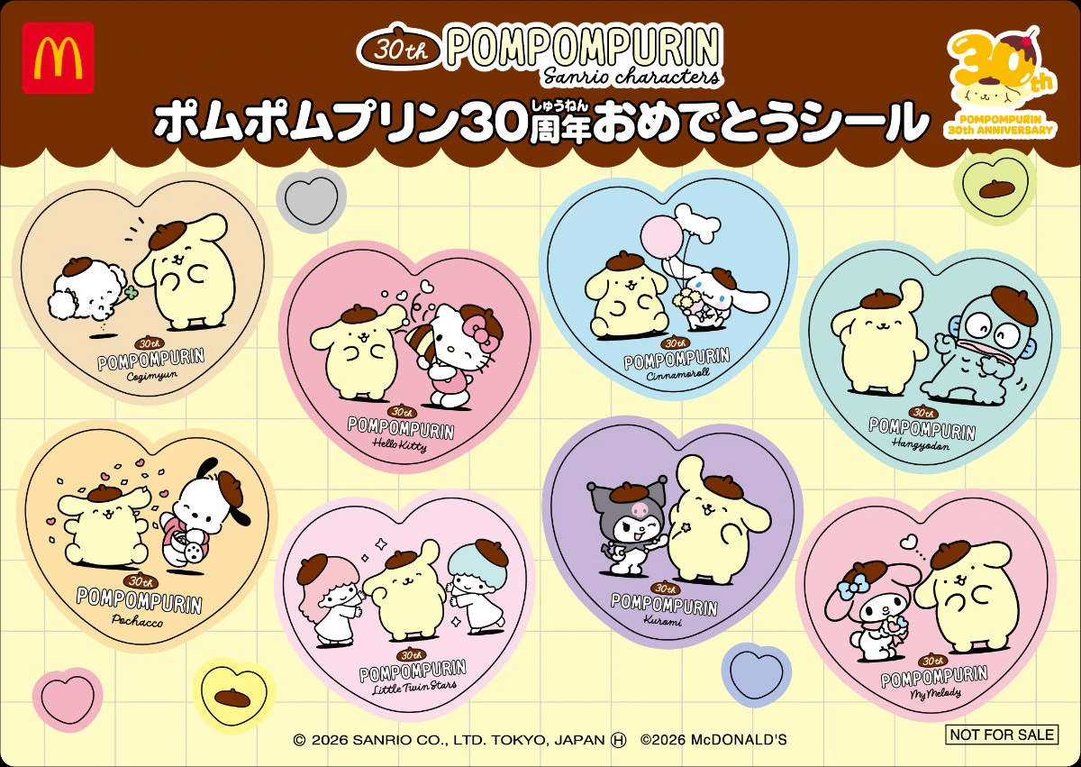 ハッピーセット「サンリオキャラクターズ」を1セット購入すると「ポムポムプリン30周年おめでとうシール」がもらえます。
