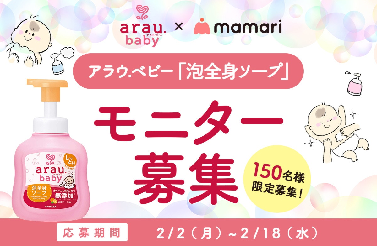 ただ今、赤ちゃんのための無添加(※)+天然ハーブにこだわる安心のブランドarau.baby(アラウ.ベビー)では、「泡全身ソープ」をお試しいただける体験モニターを募集しています!
